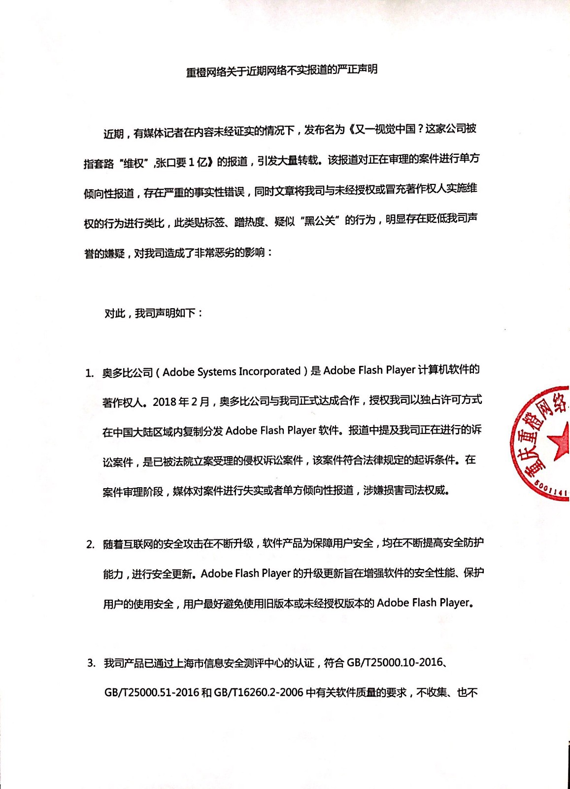 重橙网络关于与Adobe合作继续为中国大陆地区Flash Player提供技术支持与发行的声明